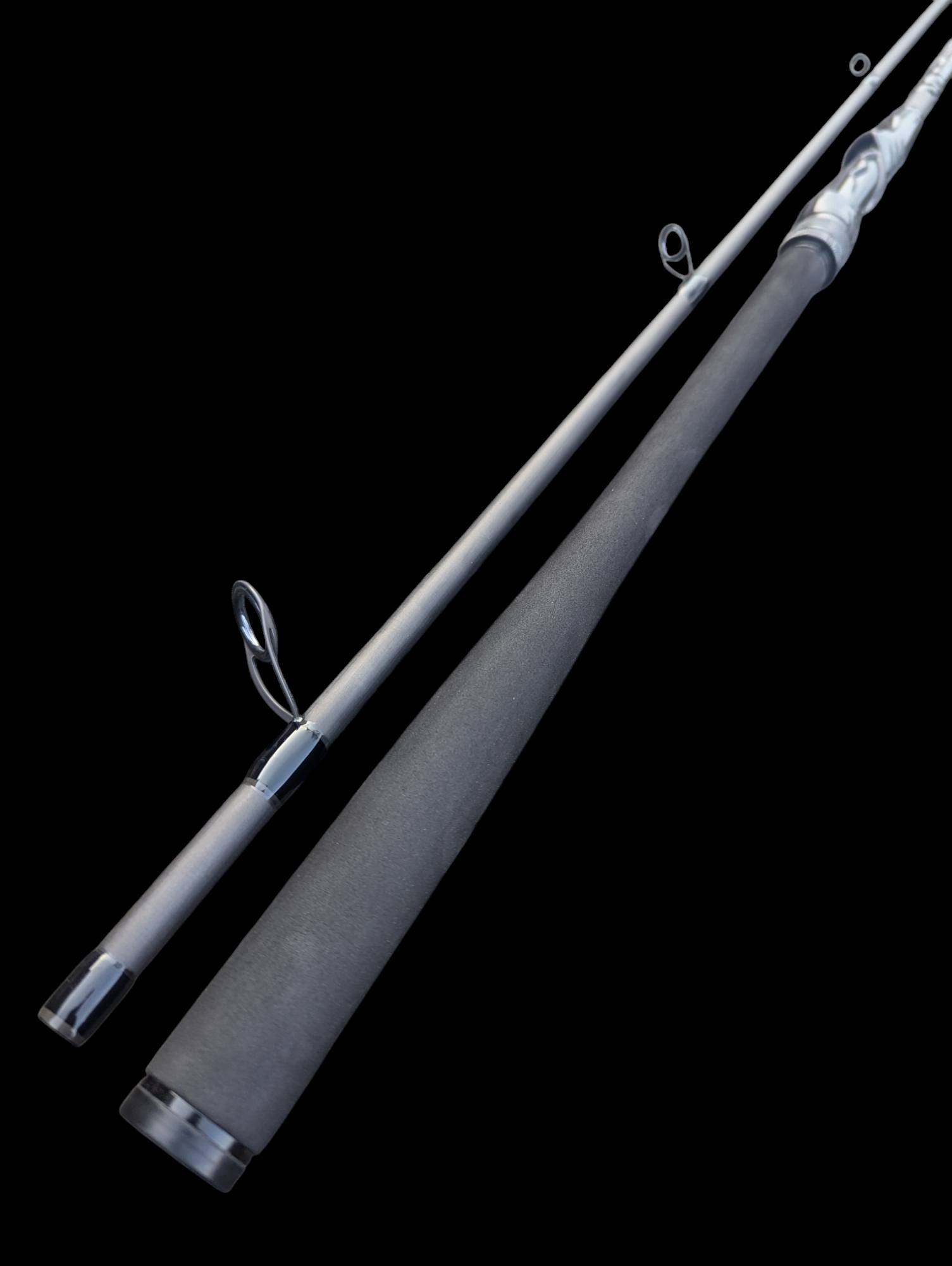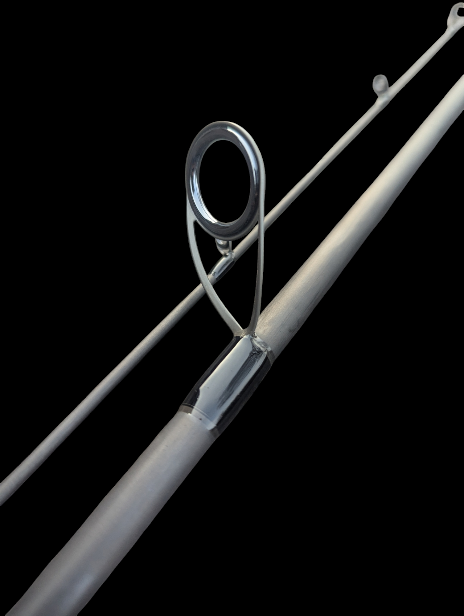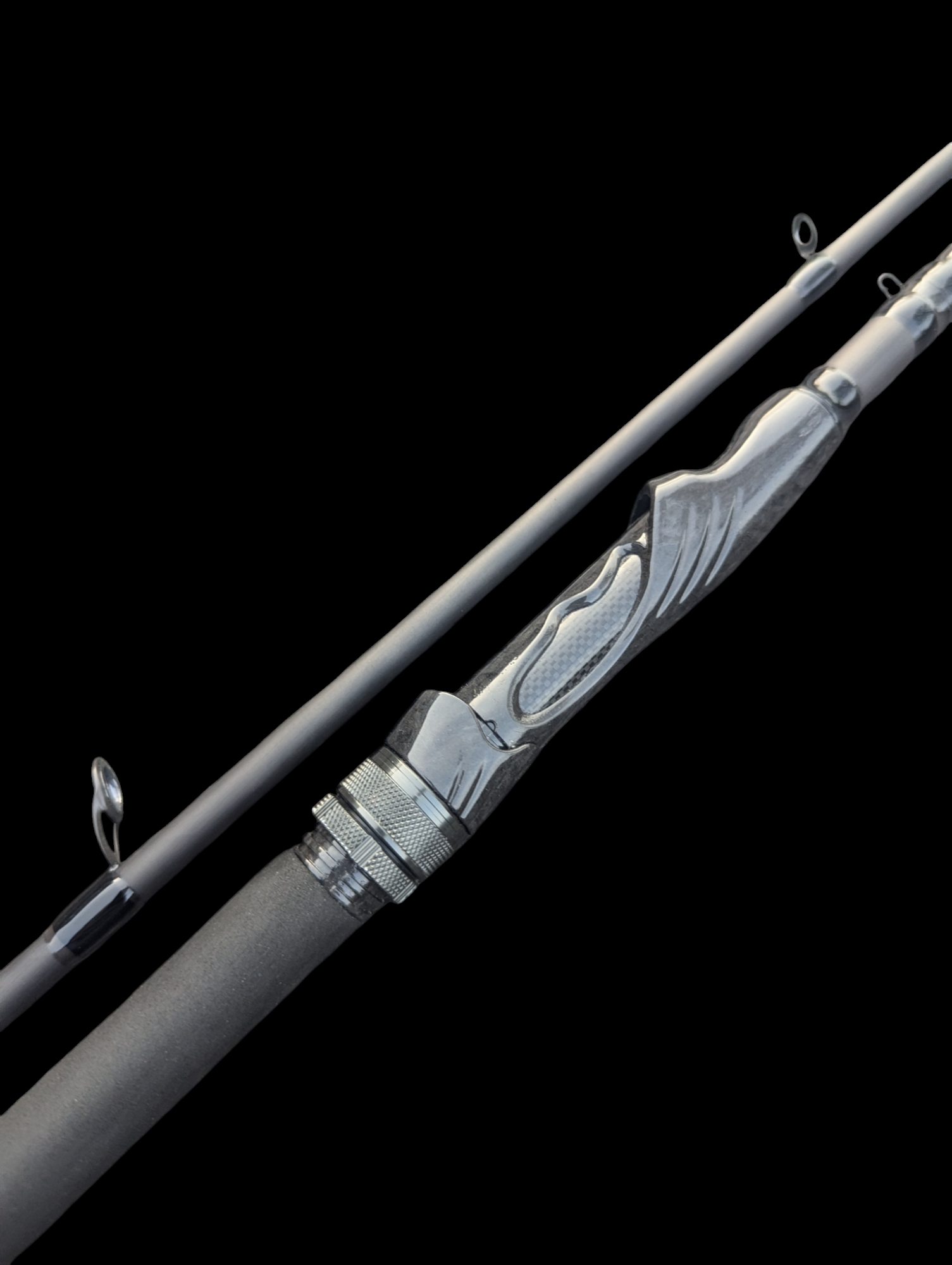 Dieser Kundenauftrag umfasste den Aufbau einer spezialisierten Rute, die sich besonders gut für die Fischerei an der Elbe eignet. Das Design ist bewusst auf eine edle Schwarz-Optik ausgerichtet, wobei selbst die Gunsmoke-farbenen Fuji K-Serie Sic Ringe diesen monochromen Ansatz unterstreichen.